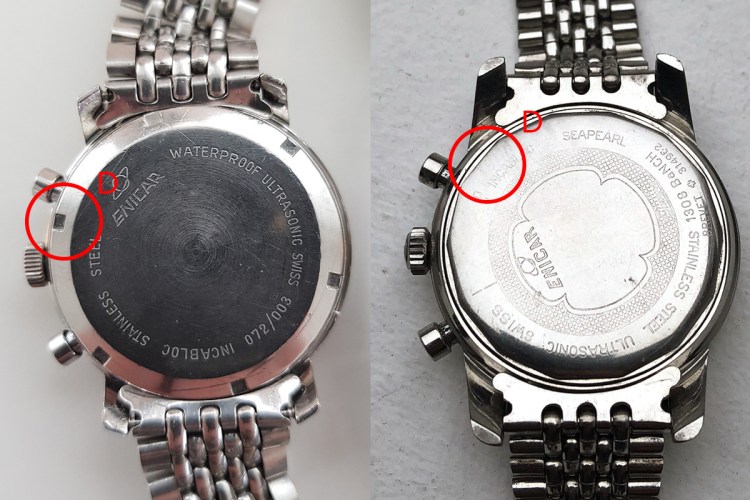 Lets have a look at the caseback. Besides the different opening marks (see D) they main difference is the missing seapearl, which was also a sign for the highly waterproof chronos of Enicar. Since the compared Sherpa Graphs is an early model its also missing the big seapearl in the middle, but at least has the text “Seapearl” on the caseback.