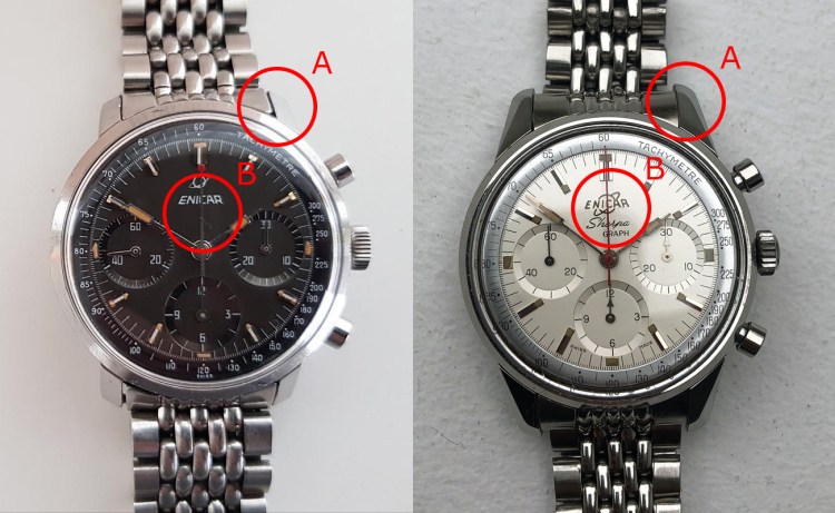 Next to the different case size (36mm to 40mm) the biggest difference are the lugs (see A). On a Sherpa Graph the lugs have the typical Enicar style you won’t find on any other brand. They are relativly long but make the watch nice to wear. In comparison the lugs on the Garnix are smaller, so the watch in general wears smaller. The next thing you will notice from the front is the missing name on the dial (see B). Sherpa Graphs chronographs allways have the name on the dial, Garnix never. This is also why it was called “Garnix” by collectors. Garnix is German and means “nothing”. This is also an easy spot to see if a Sherpa Graph has the correct dial. Offen you will find them with “Garnix” dials which look like new.