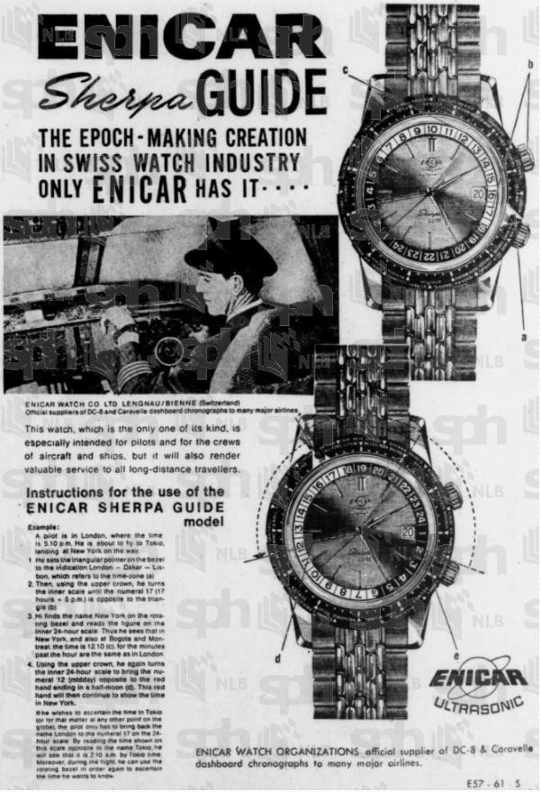 While browsing through some old newspaper archives, I found some very interesting ads regarding our beloved brand. In this case the newspapers came from Singapur, mainly published in “The Straits Times”. While normally you find blog posts about the Graph chronograph series from me, this time I want to write about another and very special chronograph, that I allready teased in regard to the Sherpa Graph MKIa with the no lume hands. In the future I will stick to that path and also write about general interesting Enicar discoveries.