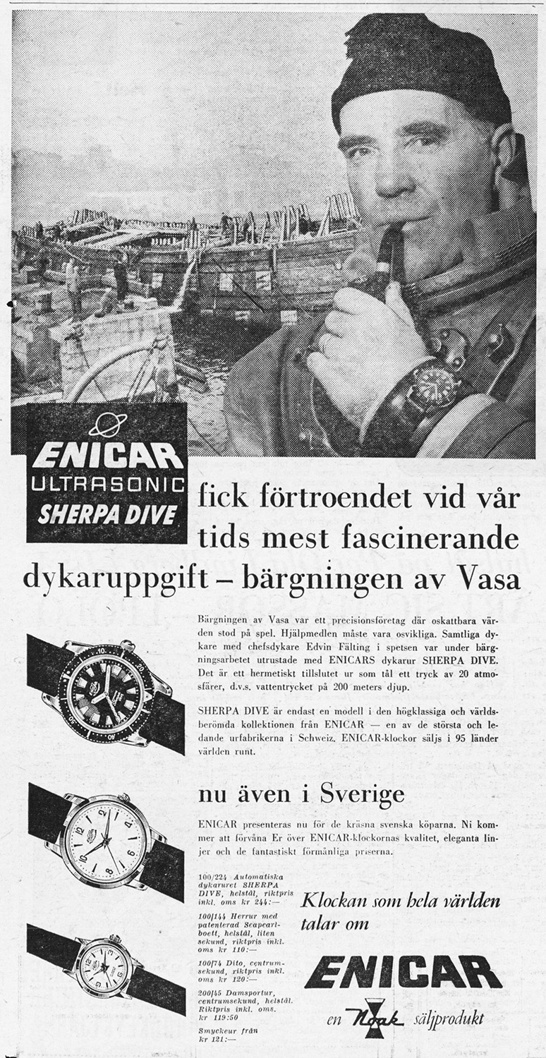 Especially in Sweden Enicar used the motive with diver Fälting long into the late 1960s and advertised their watches with the successfull salvage of the famous Kings Ship.