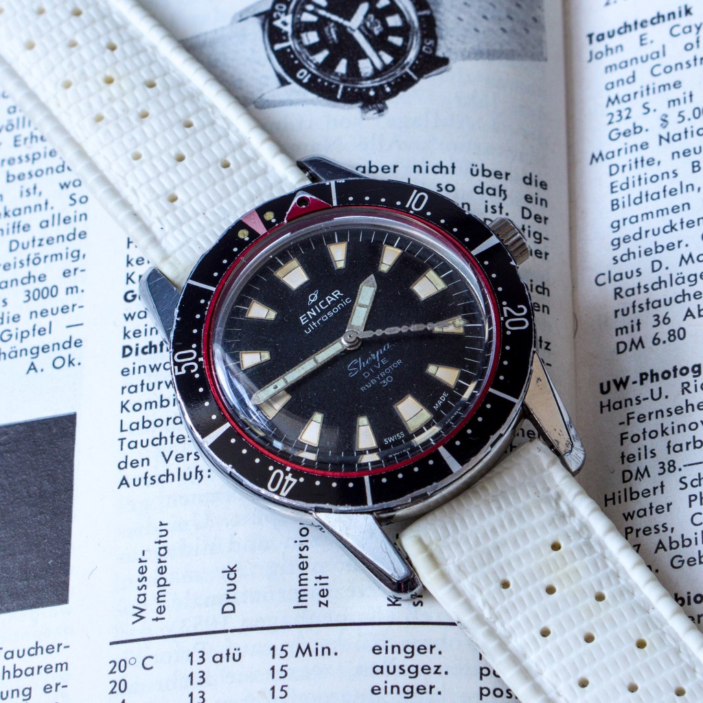 Just recently I got all issues of the German diving magazin “Neptun”. First issued in 1960 and discontinued in 1967 it is a nice archive of diving history. In the following example of January 1961 you will find the review of an Enicar Sherpa Dive which I’d like to share with you.