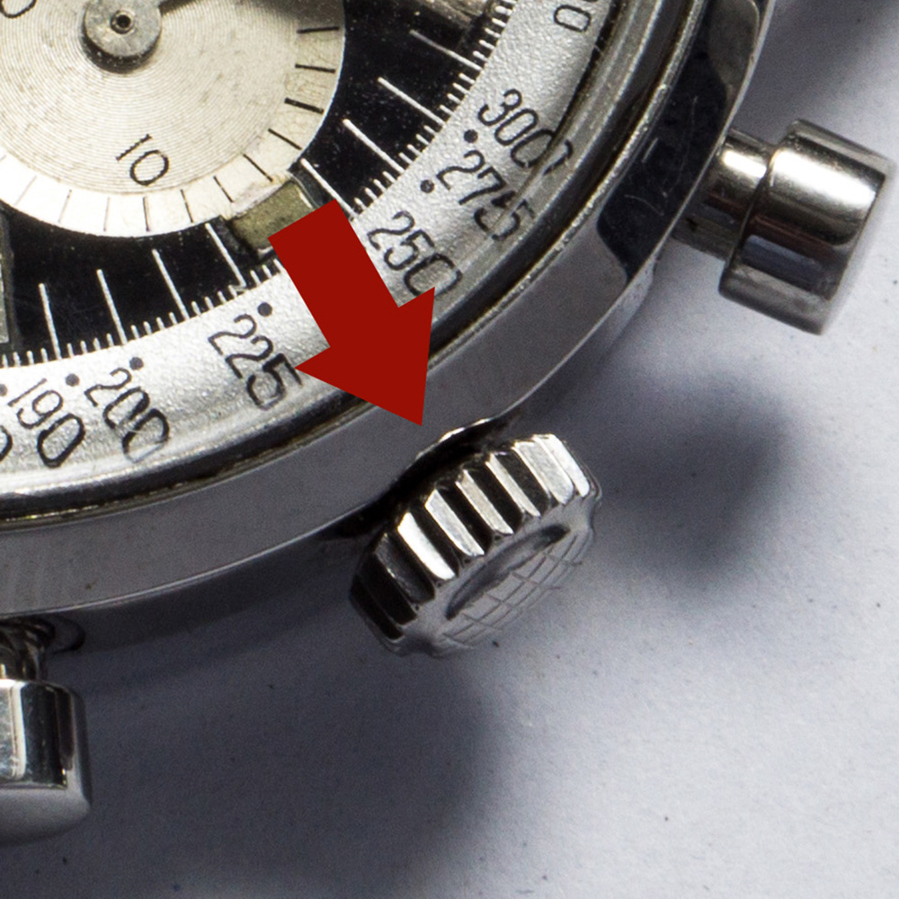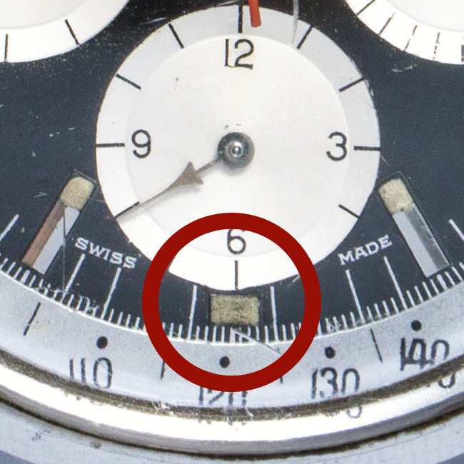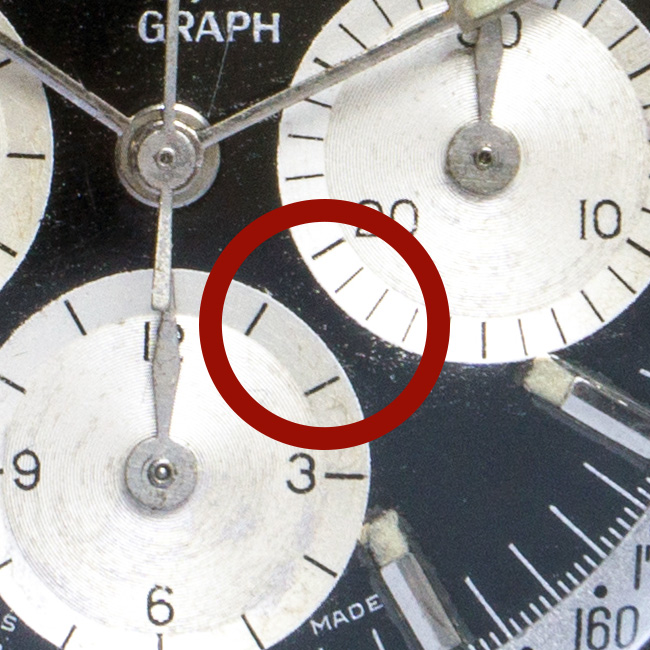 The next thing you can easy spot from the front of the watch is the inner tachy scale. This has to be a “Tachymetre Base 1000” one on the MK1a. I have seen some lonely watches in later executions with this bezel, but the numbers are so small, that I believe those are either left overs or franken watches.