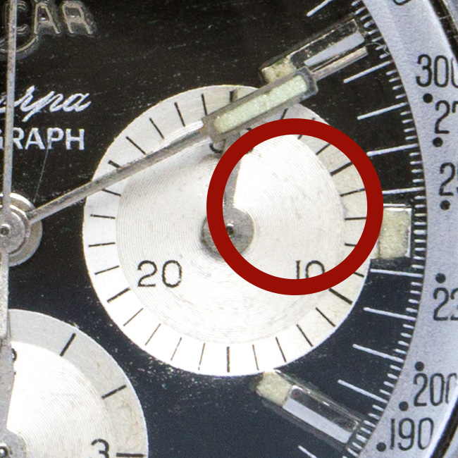 Lets have a look at the crown. When most people first see an MK1a Sherpa Graph, they think the crown was changed, cause it is missing the Saturn on it. Since we are speaking of 1960 as year of production, this really is a bit strange cause all the other Sherpa watches, like the Divers had waffle crowns with a logo on it. My only explanation is that the manufacturer of these wasnt ready to supply this crowns with a tap 12 configuration (that means a 1.2mm stem, that you need for a hand wound Valjoux 72) until the Sherpa Graph MK 1b.