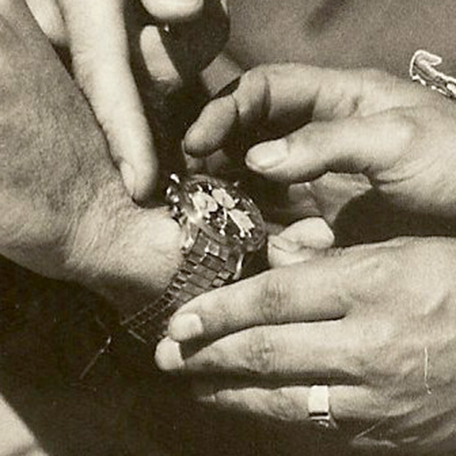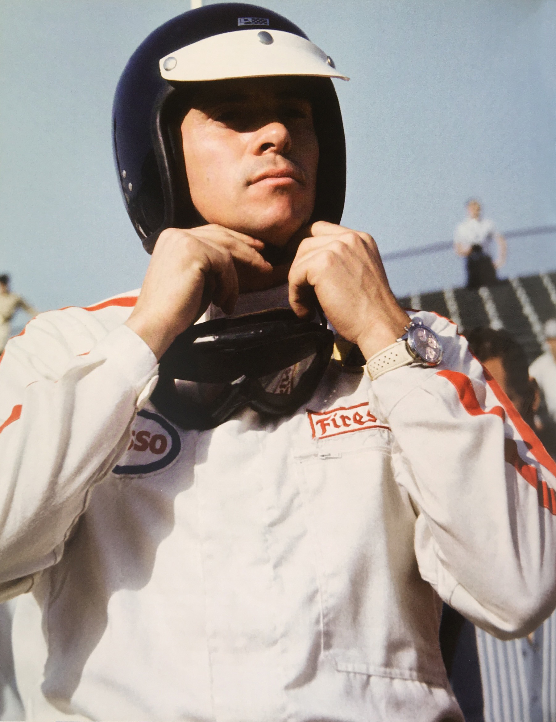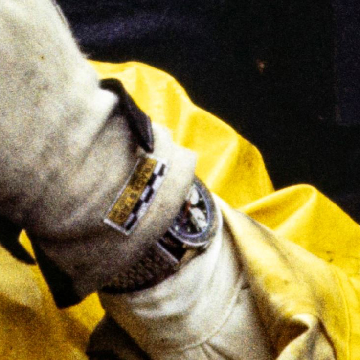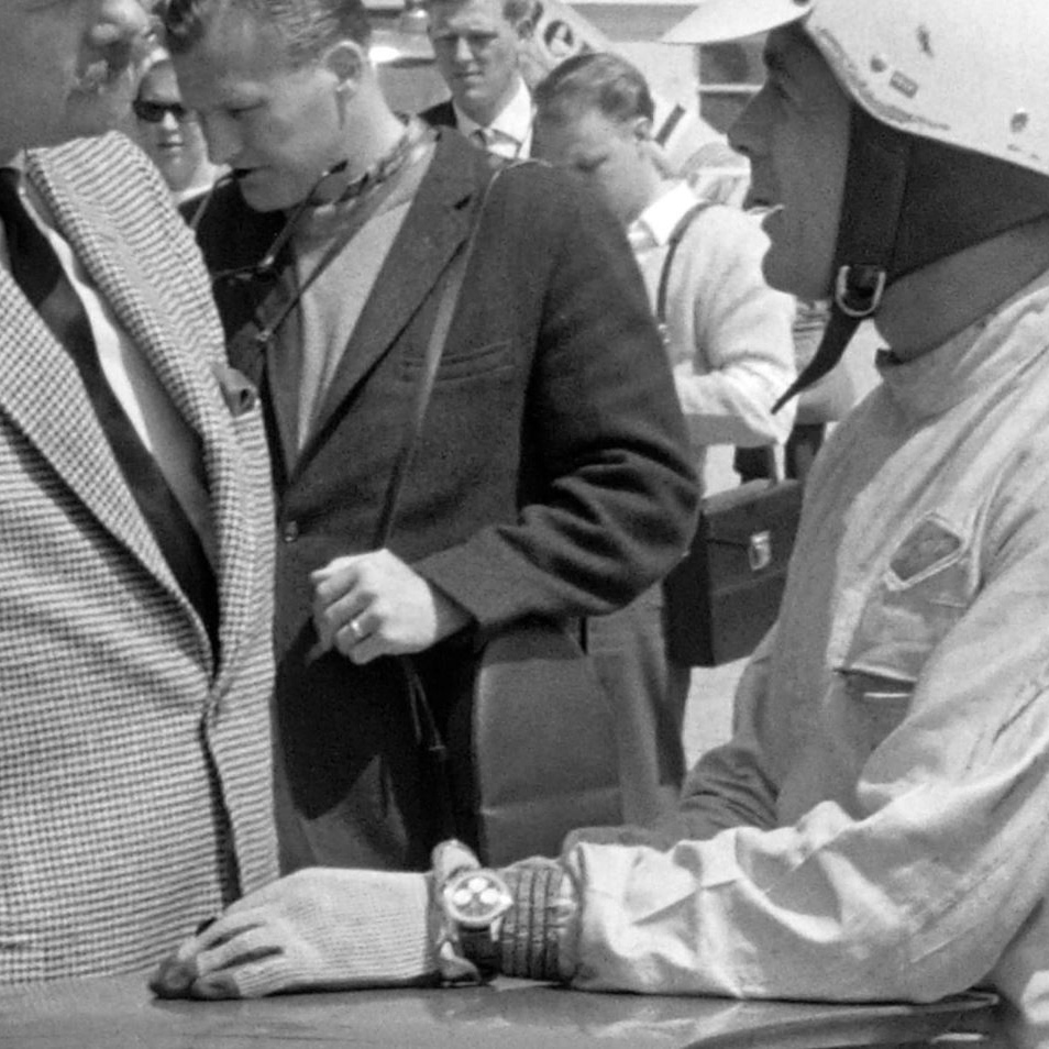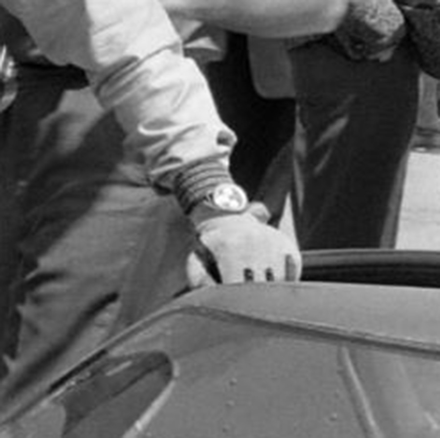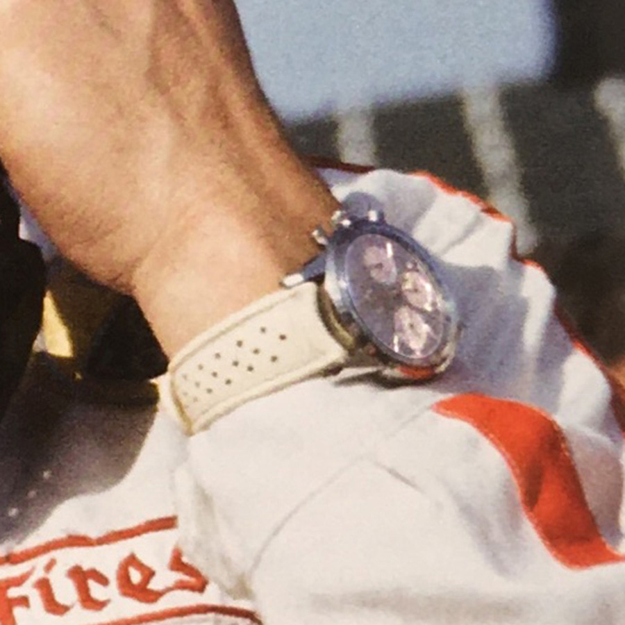 While smoking a cigarette with his racing buddies he is showing us his wrist. Therfore we can have a closer look. With the reverse panda dial, the hard to recognize paddle hands and of course the date the picture was taken on, it has to be a MK1 reference. With a lot of fantasy I also see a Tachymeter printing on the bezel. For me the left subhand dial looks different to the other ones (thin vs. e.g. arrow), so normally we could rule out a MK1a, which was connected to Ireland in the past. Since the quality of the pics isn’t good enough, I tend to say we leave that for further investigations,….but its a Sherpa Graph for sure.