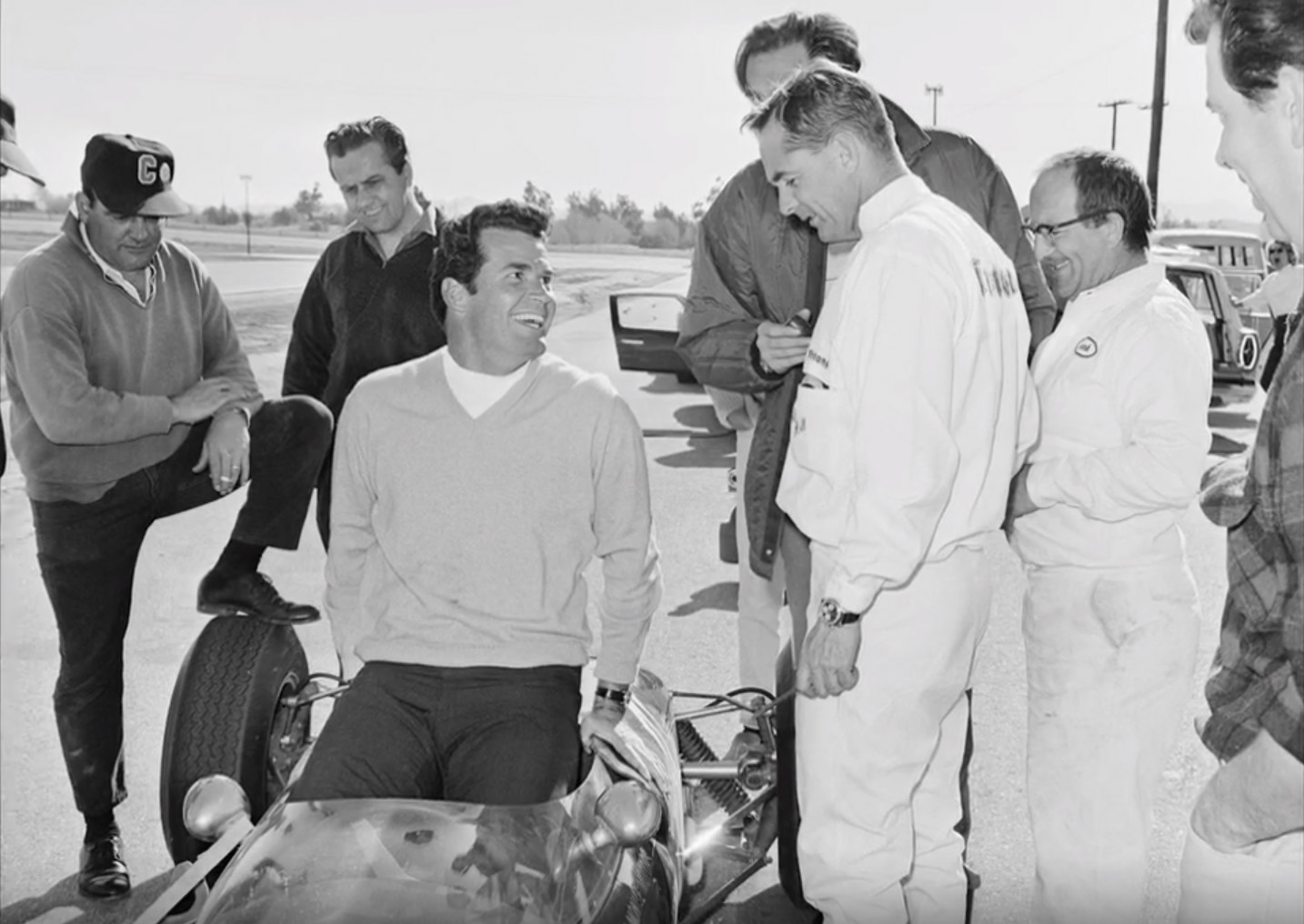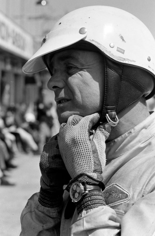 A name that is more or less new in the game is American racer Phil Hill. A pic of him in 1966 during the filming of the legendary Grand Prix movie was showing him with a watch, that might have been a Sherpa Graph. But the picture quality was to bad to be sure. So let’s have a look on what I found. In 1964 Hill was racing in Zandvoort, Netherlands. Thanks to a great shot we at least can see the case. No doubt its a Sherpa Graph one.