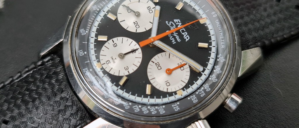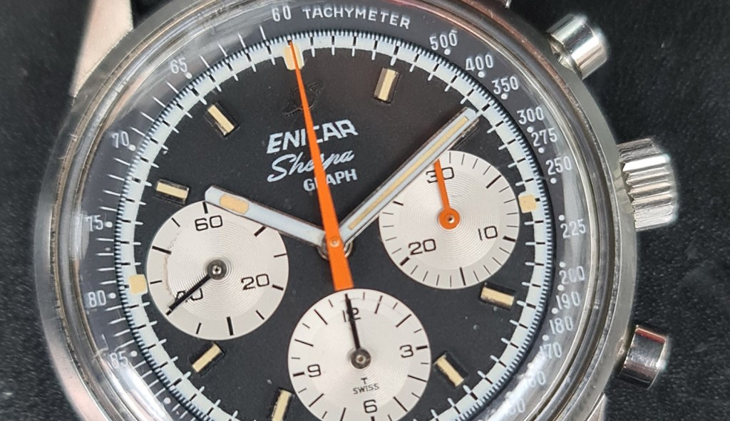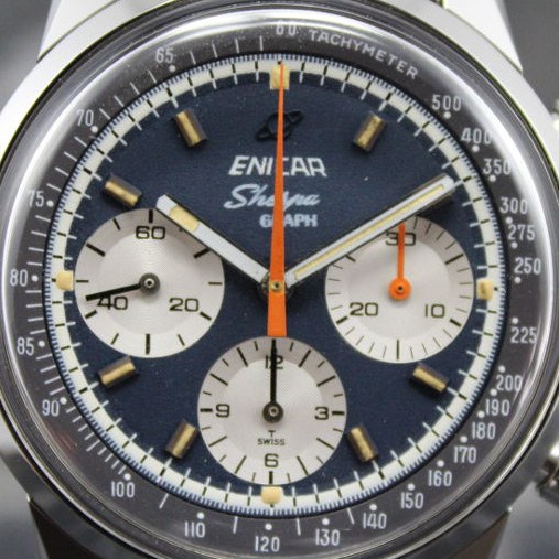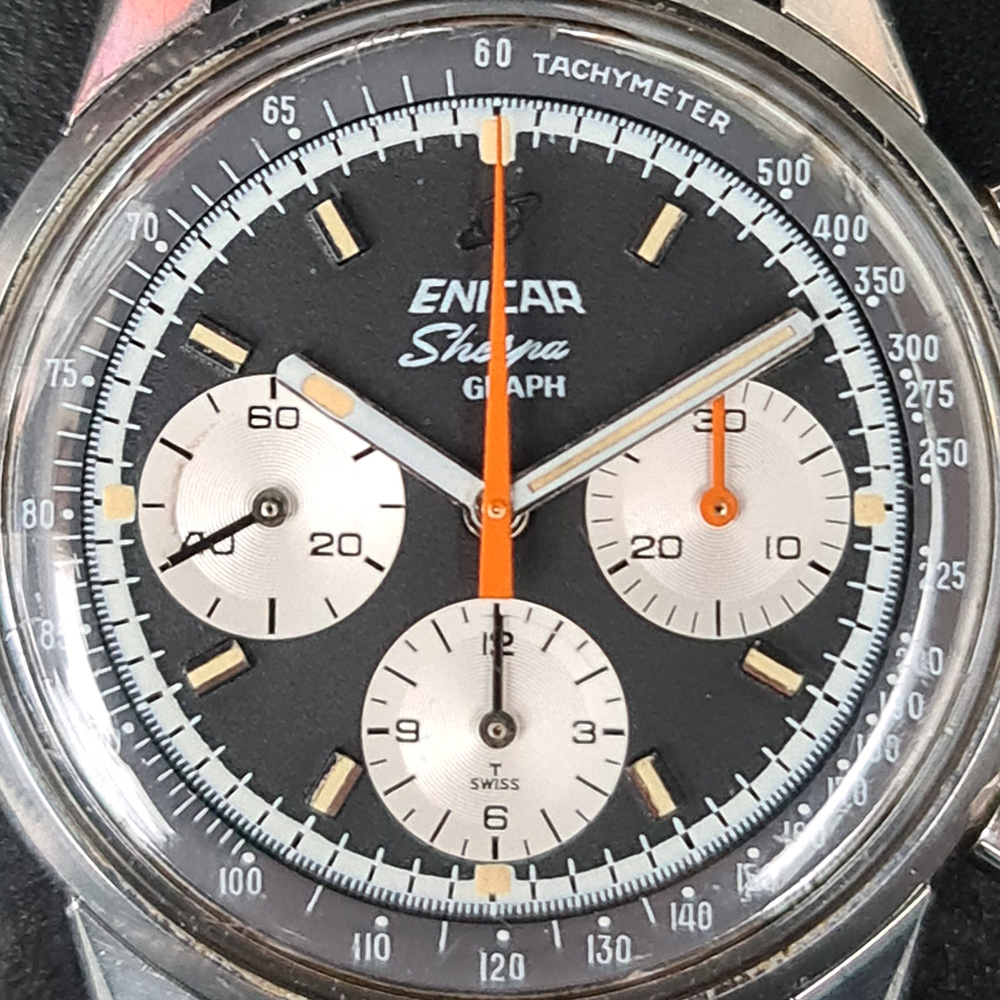 Although the Sherpa Graph was more like a racing watch h you will find the waffle compressor crown with Enicar saturn on it.
