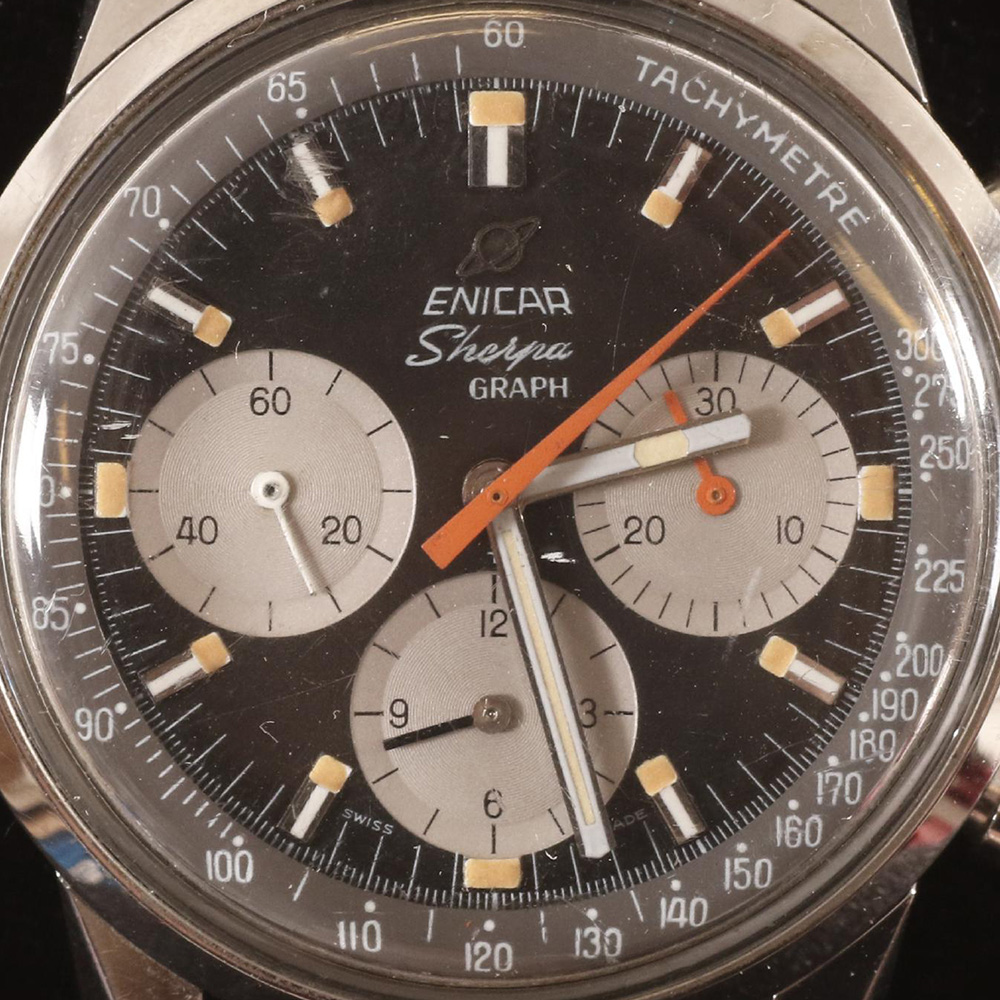 The most common dial version known is black with white sub dials. The Enicar logo is applied and the logo and fonts are similar in style to the Mark III. On some dials the words Sherpa Graph can appear slightly bolder or even slightly fuzzier than the Mark III dials which we believe is down to less stringent quality control methods by Enicar. Other variants also exist with the most common being the white dial version with either grey or silver sub-dials, a black dial version with grey sub-dials and a blue dial version with white sub-dials.