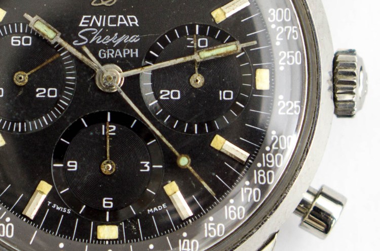 In the range of the MK IIb you just can find the all black dial variation and the one in black and silver. The Enicar logo is still the small one, above the word Enicar. The lume on the dial is made of Tritium.