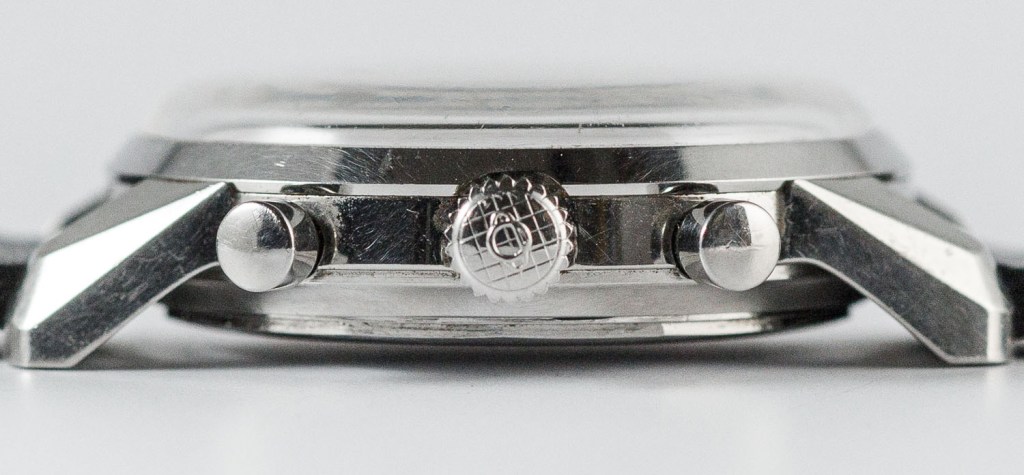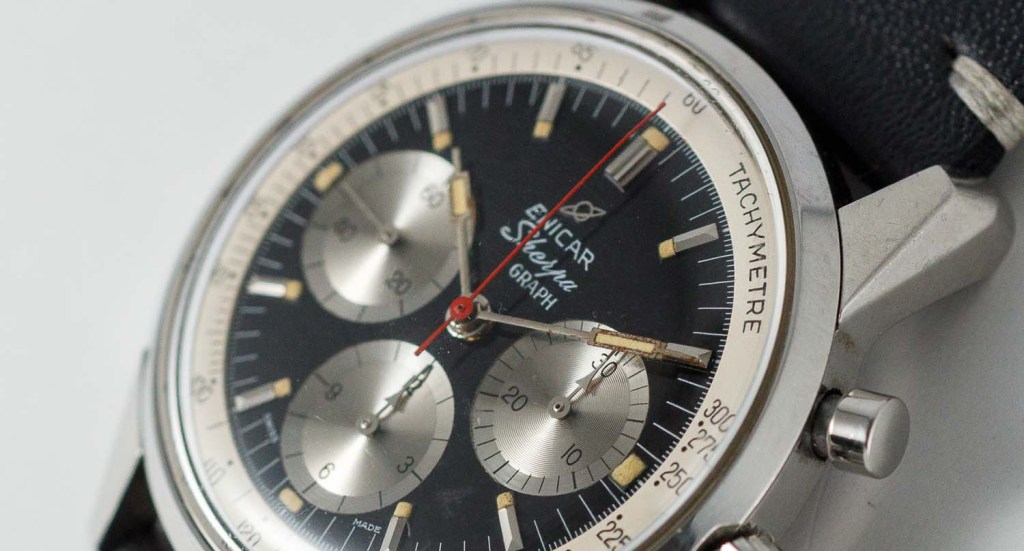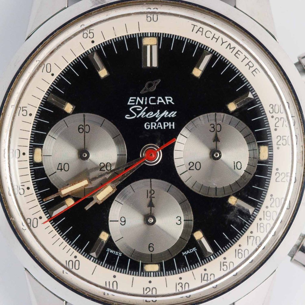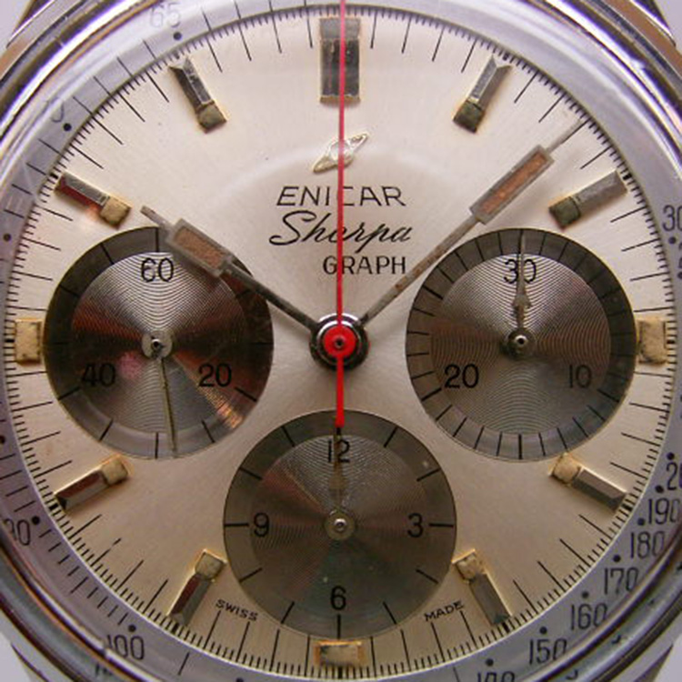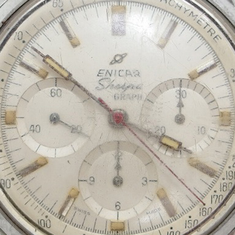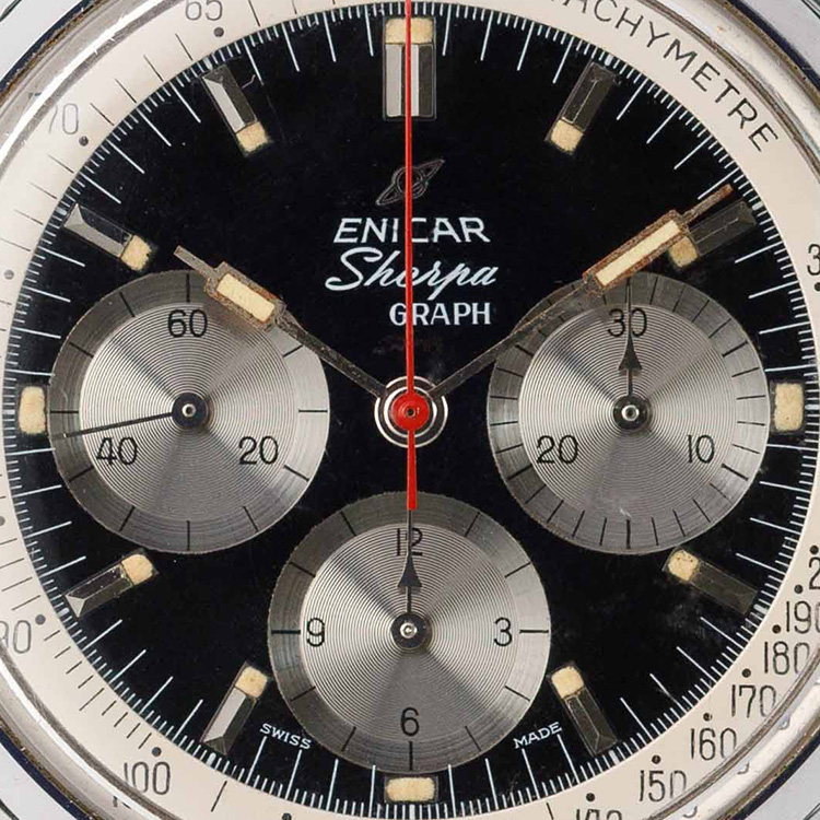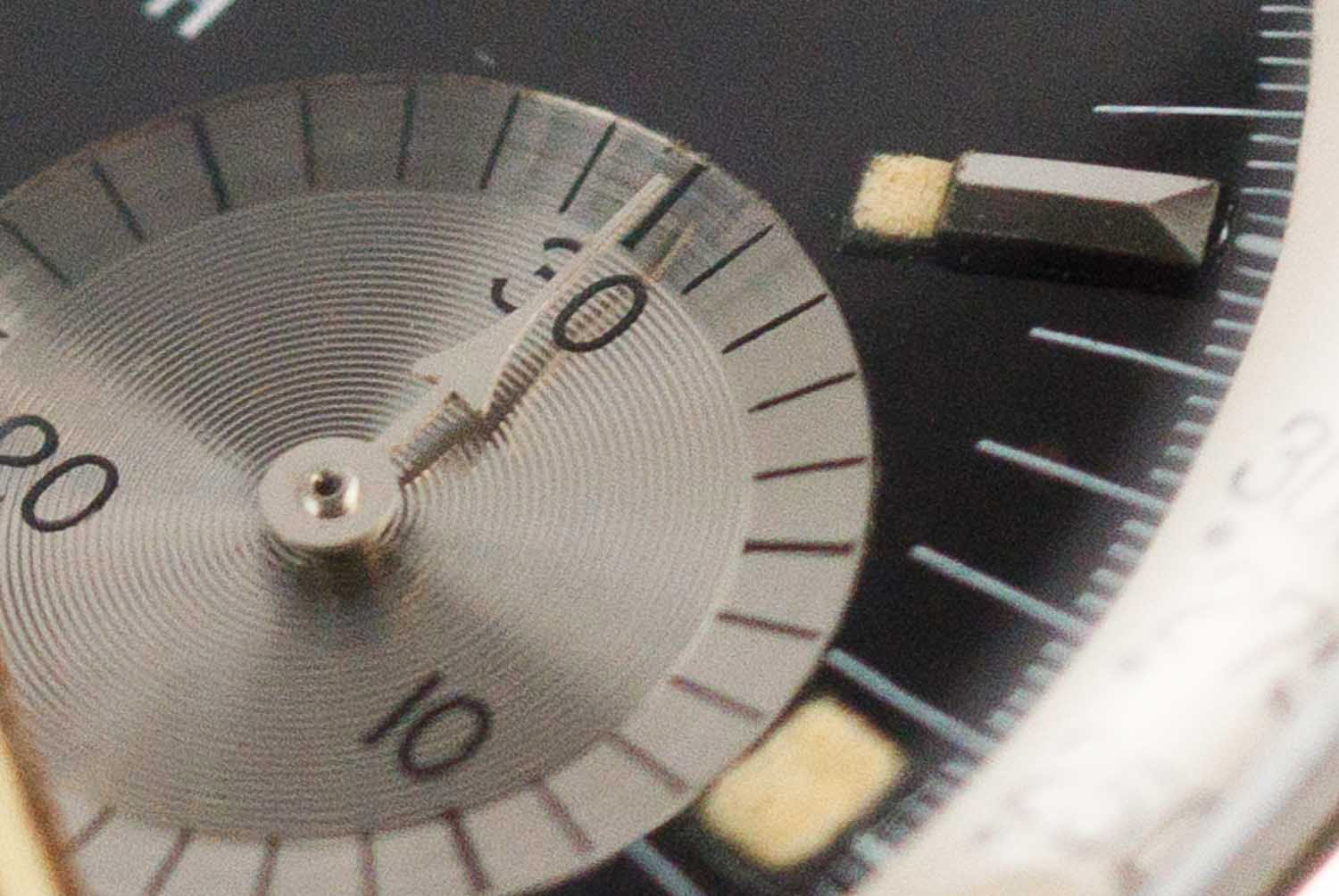 In the range of the MK IIa you can find a white dial, a white-silver dial, an all black dial and the most common dial in this reference made in black and silver . The Enicar logo is now the small one, above the word Enicar (early 601.xxx watches still have still the old big logo). The lume on the dial is made of Tritium.