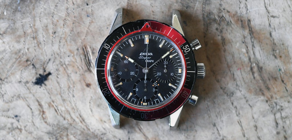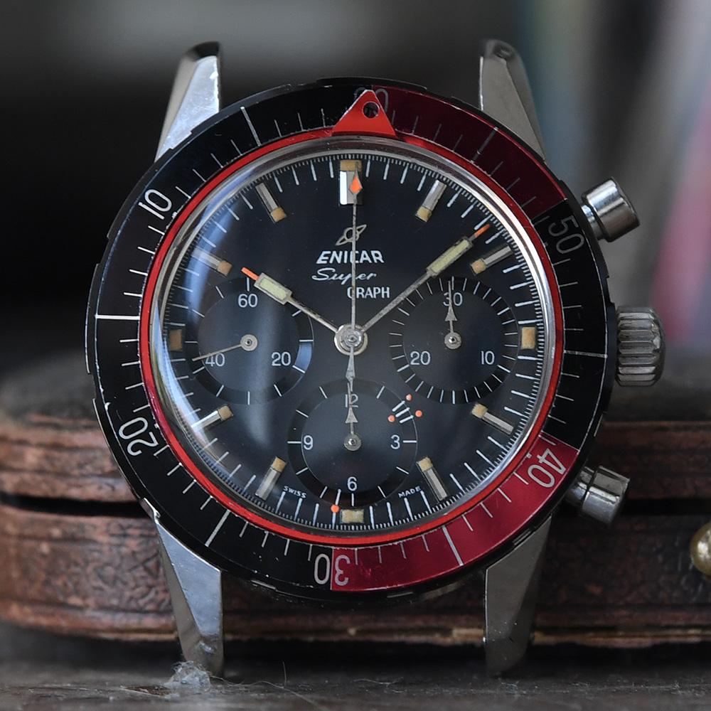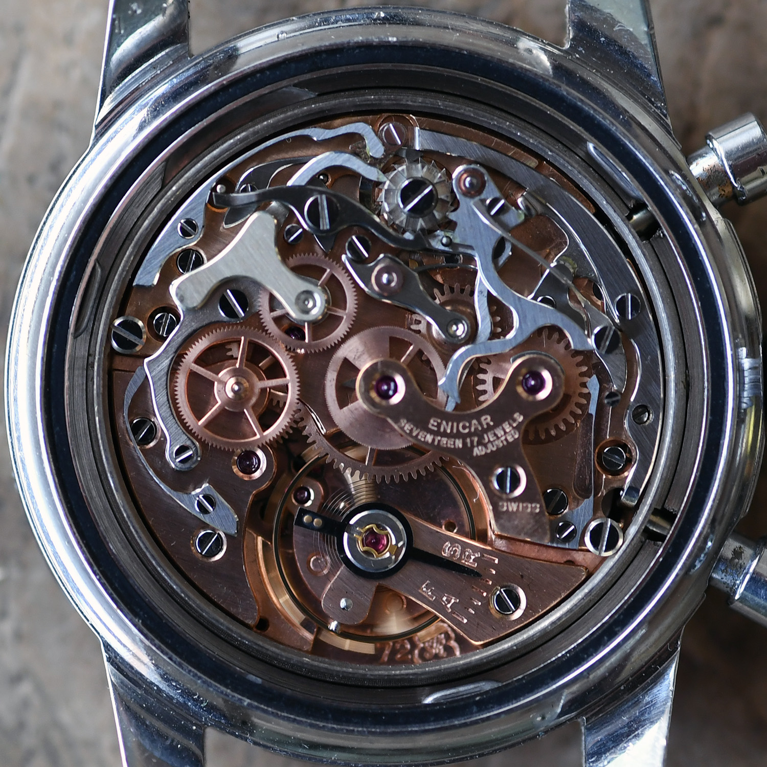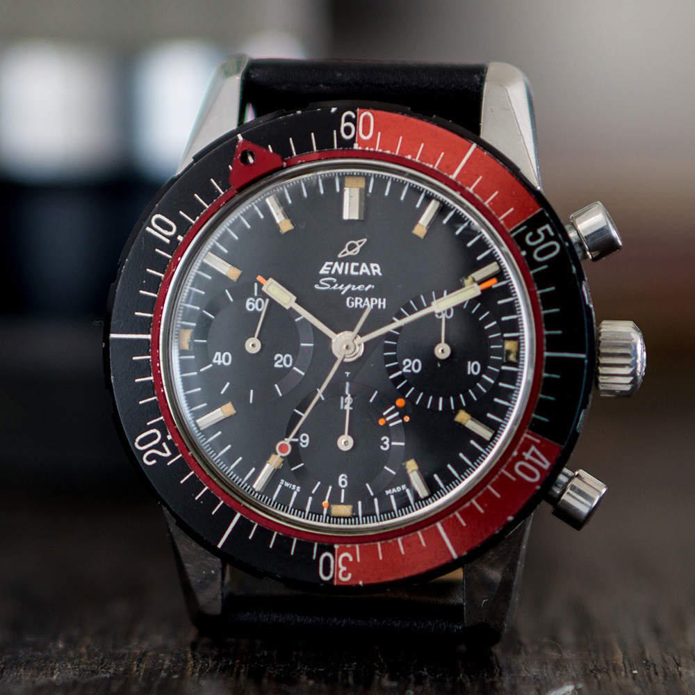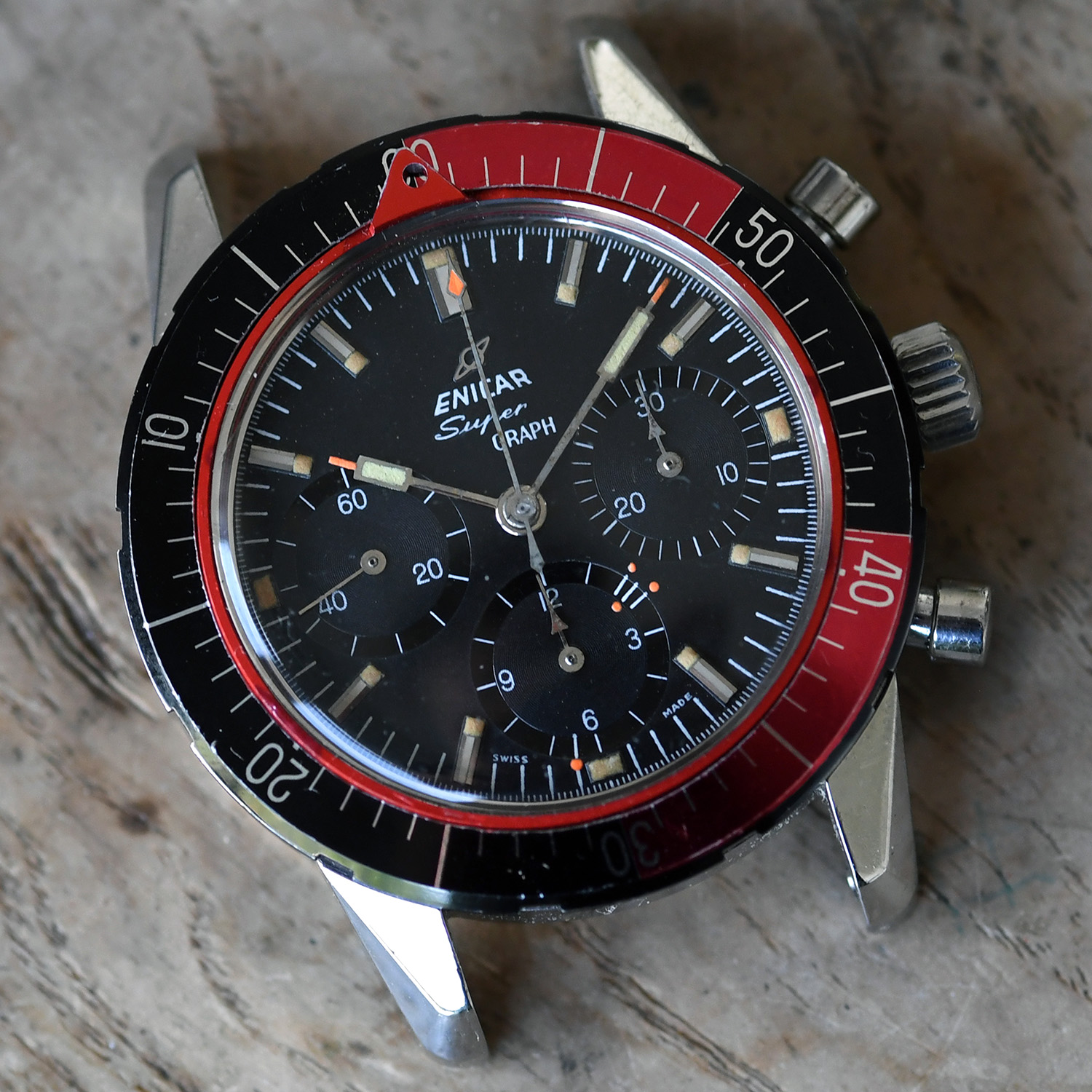 The Super Graph “Simonet” is one of the first Super Graphs and was custom designed for the 1964 Tokyo Olympic Games shooting competitions. The Reference number is 072 / 002. More on the history of this watch you can find here: “Blog: Enicar Super Graph “Simonet”